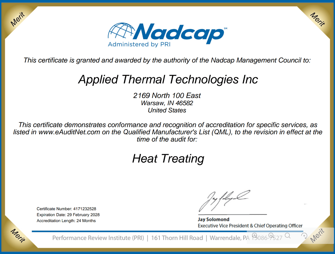 20. Applied Thermal Technologies Inc. received its 4th consecutive 24-month merit for Nadcap.