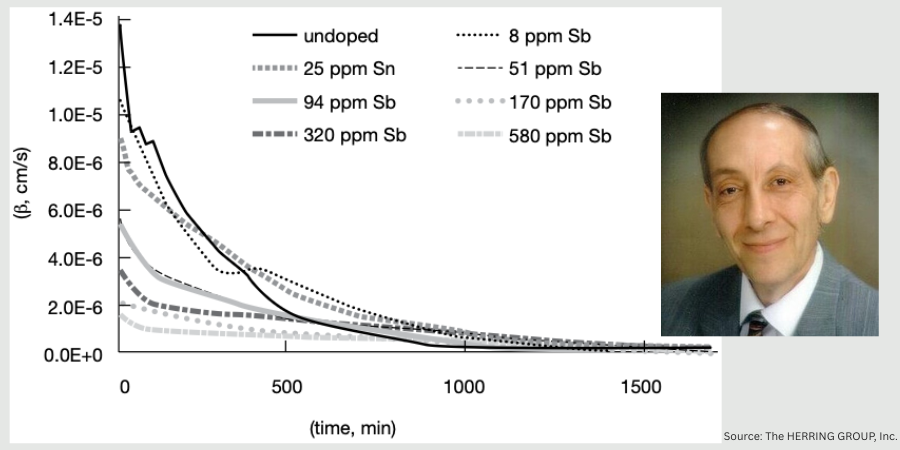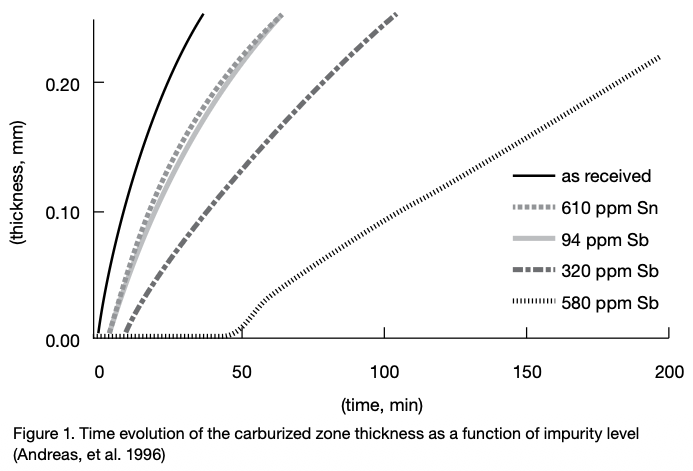 The use of scrap in steelmaking, especially for low alloy case hardening steels can lead to a relatively high level of impurities and tramp elements. At high temperatures these impurities tend to segregate at grain boundaries and migrate toward the surface. This type of segregation can retard case hardening by impeding element (e.g., carbon) transfer. For example, the effects of tin (Sn) and antimony (Sb) on the kinetics of carburization are particularly problematic (Figure 1).