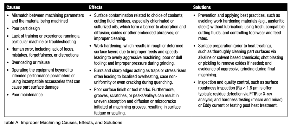 While machining problems occur frequently, they are mostly preventable. Attention to part surface condition, cleanliness, and mechanical integrity is essential before heat treating. Training, standardizing machining protocols, planned preventative maintenance programs, and part inspection prior to heat treating will help avoid these issues. Consult Table A for further details on how the causes and effects of undesirable machine-induced surface conditions can be solved.