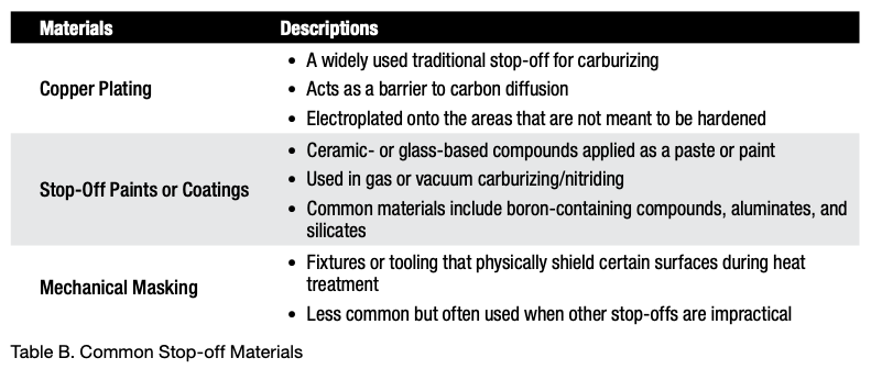 A material that masks the surface of steel and delays or prevents case hardening is called a stop-off or maskant. These materials are applied to specific areas of a steel part to prevent the diffusion of hardening elements (like carbon or nitrogen) into the surface during case hardening processes, such as carburizing, nitriding, or carbonitriding. (See Table B.)