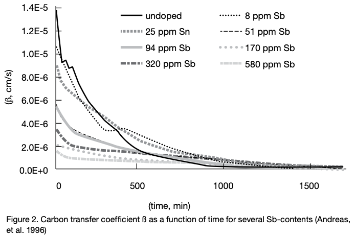 The effect of tramp elements on retardation of carburization can be expressed in the following order (Andreas, et al. 1996), namely Sb > Sn > P > Cu > Pb. To see the effect of one such element, the carbon transfer coefficient (ß) for typical commercial steels is shown as a function of antimony (Sb) content (Figure 2).