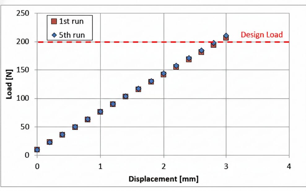 Figure 3. Displacement-load curve of the Z-type C/C composite spring | Image Credit: CFC Design/ACROSS USAFigure 4. Z-type C/C composite spring dimensions after heating and subsequent heating runs | Image Credit: CFC Design/ACROSS USA