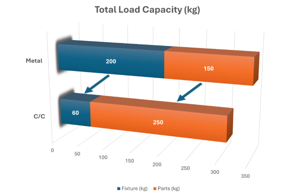 Increased capacity: In a specific industrial application, C/C fixtures weighing 66 kg (145 lb) replaced 200 kg (440 lb) stainless-steel fixtures.