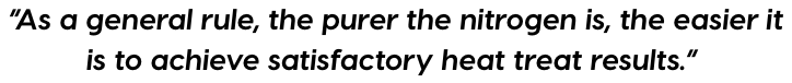 The final discussion point I will share from the interview today is about the variability in accepted purity based on the planned usage of nitrogen. The three Air Products experts pointed out that NFPA86 mandates that the atmosphere in a furnace must be below 1.0% oxygen before any flammable gas species can be introduced. So, they continued, nitrogen used solely for safety purging can be relatively impure and still achieve the 1.0% maximum oxygen allowed. When used as the sole atmosphere component (i.e., 100% N₂), or as a carrier gas blended with an active gas like hydrogen, they explained that nitrogen purity must be much higher in order to achieve acceptable surface quality. In general, for atmosphere uses, it should be assumed as a general rule that the purer the nitrogen is, the easier it is to achieve satisfactory heat treat results. The three concluded this thought noting that in blended atmospheres it may be possible to use slightly higher levels of active gases (like hydrogen) to react with excess oxygen in the nitrogen supply, but that approach is unlikely to make sense economically since nitrogen is typically far less expensive than an active gas.