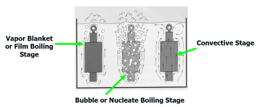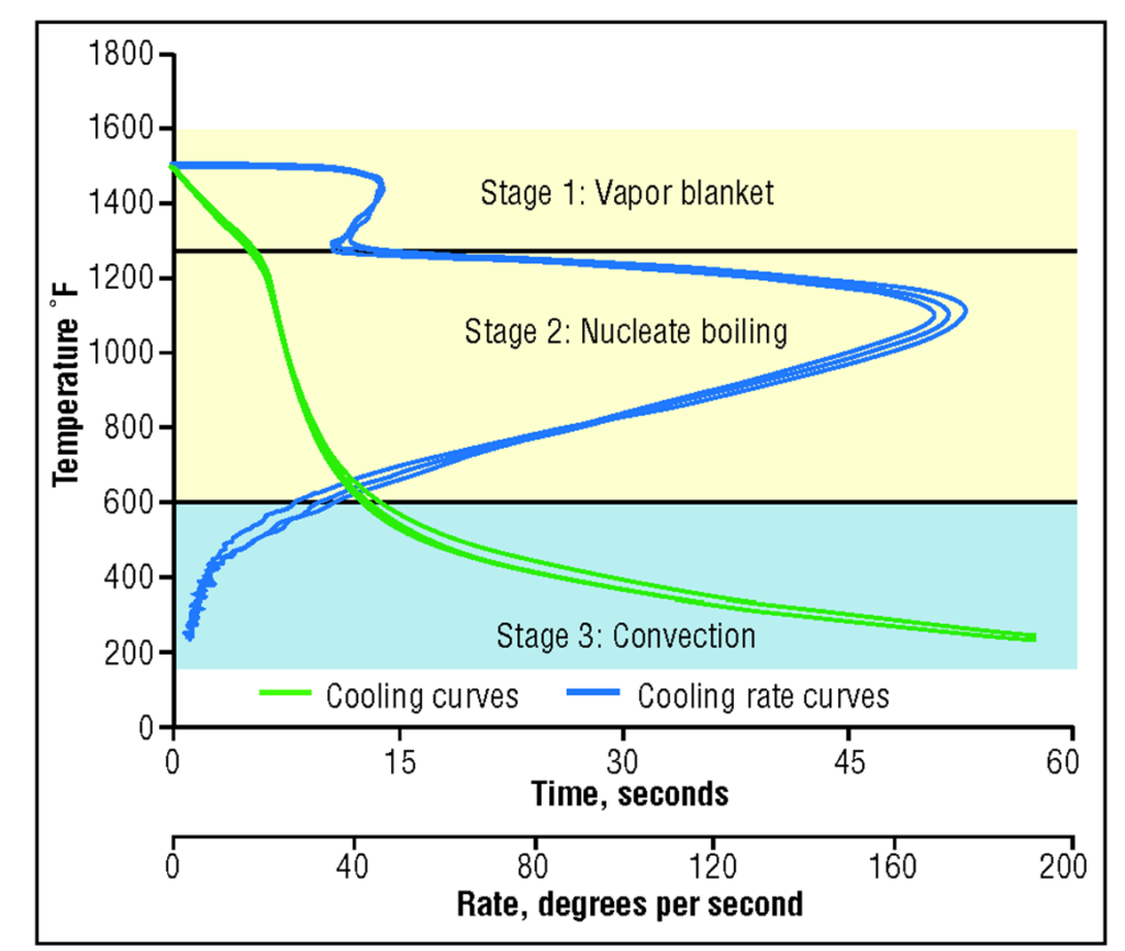 As a brief reminder, let’s revisit the three distinct stages of cooling (Figure 1). The first stage, the “vapor blanket” (or “film boiling”) stage, is characterized by the Leidenfrost phenomenon, which is the formation of an unbroken vapor blanket that surrounds and insulates the work piece. It forms when the supply of heat from the surface of the part exceeds the amount of heat that can be carried away by the cooling medium.