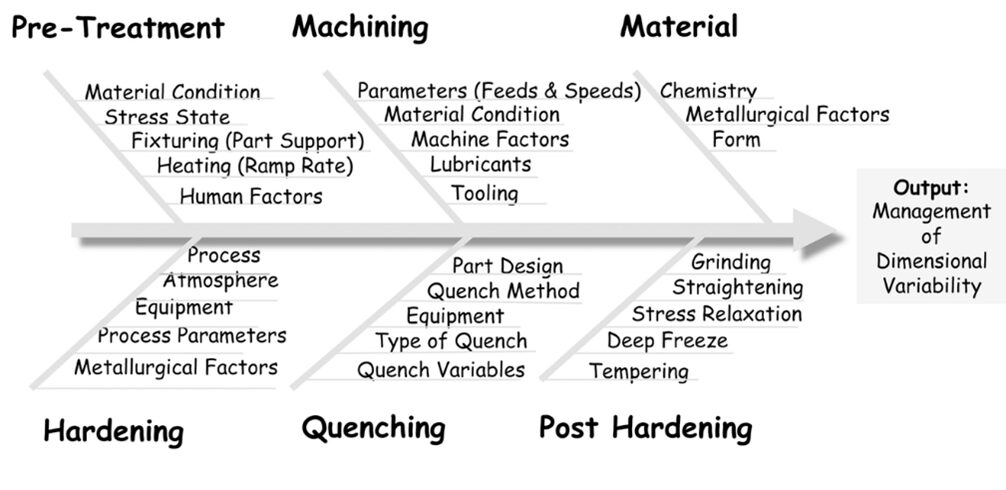 A number of factors influence post-heat treat distortion, including those related to material, manufacturing, and heat treating (Figure 3).