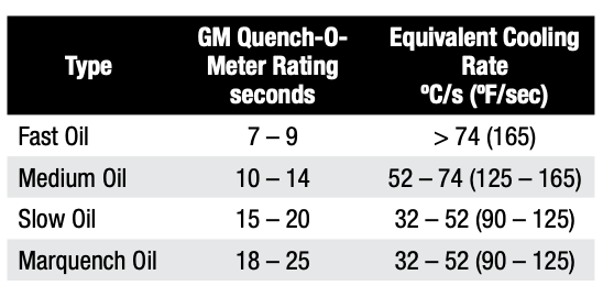 - Oil speed, condition, viscosity (fast, 7–9 second oil; medium, 10–14 second oil; slow, 15–18 second oil; or marquench, >20 second oil)