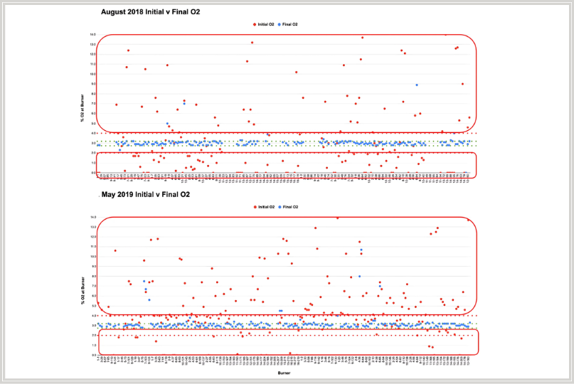 On top of this inefficiency, combustion ratios drift over time. Burners fall out of tune, air-to-fuel ratios shift, and temperature distributions across zones become imbalanced. Even with regular maintenance, most furnaces run well below their optimal performance for a significant portion of their operating lives. See figures 1a and 1b, which illustrate how quickly furnaces drift out of tune. Therefore, regular monitoring and adjustment are essential to avoid energy losses and reoccurring performance issues.