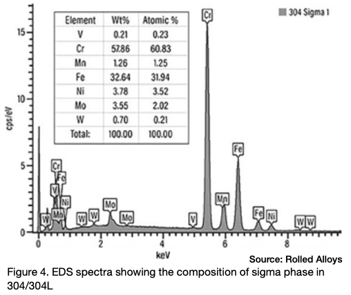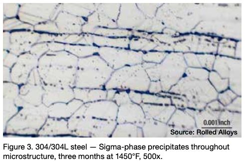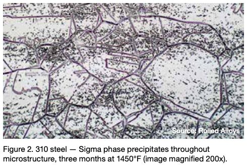 Sigma phase precipitation is a phenomenon that occurs in stainless steels and alloys containing less than 35% nominal nickel content. This does not occur in nickel alloys with 35% nickel or more. Sigma phase can make materials very brittle at room temperature. However, at elevated temperatures within typical heat treating ranges, most materials retain sufficient toughness to be used without any concern. It’s important to note that even at high temperatures, toughness is lost. More caution should be exercised in choosing alloys for vibrating systems, as constant vibration can cause premature failure if sigma phase has formed.