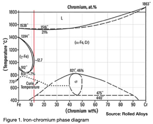Sigma phase is an intermetallic compound made up of chromium and iron. It is hard, brittle, and non-magnetic. At room temperature, the presence of sigma phase can make the material so brittle that a sudden, hard impact can shatter a piece of metal that contains it, similar to a piece of glass. Pure sigma phase forms when the chromium content is between 42% and 50%, and it is one of the equilibrium phases in the iron-chromium phase diagram as seen in Figure 1.