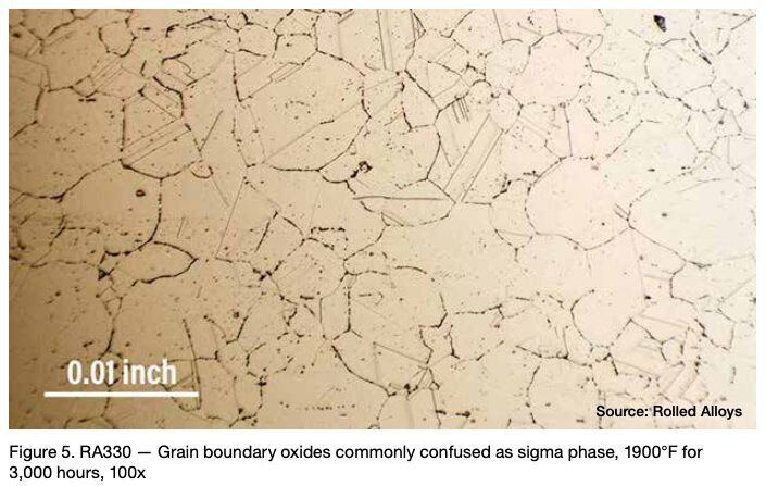 Figure 5 depicts RA330 after a 3,000-hour duration at 1900°F. Despite 1900°F being significantly higher than the sigma formation range, some engineers determined that the grain boundary oxides were sigma phase. When there is any uncertainty, it is advisable to consult with a metallurgist who is knowledgeable about the metallography of these alloys.