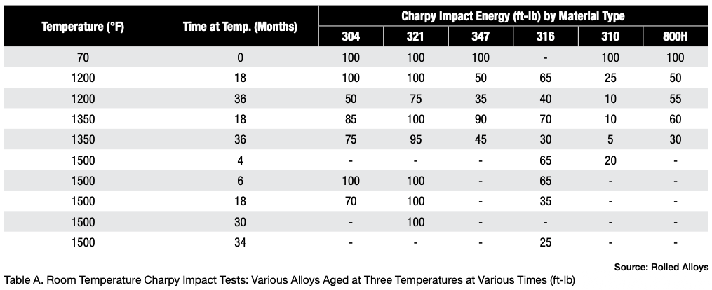 When these alloys have formed sigma phase and then cooled to room temperature, it’s important to prevent any kind of impact. At operating or heat treating temperatures, these alloys generally maintain enough ductility to be safely used.