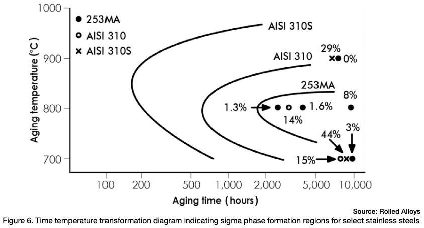 Figure 6 depicts the time temperature transformation curves for sigma phase formation for a few different stainless steels. Any point past a specific alloy’s curve results in the formation of sigma phase.