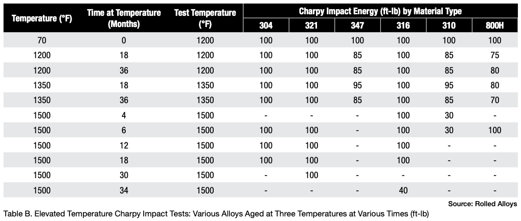 Table A displays the results of impact testing for six different alloys aged at three different temperatures for varying durations. All the alloys experienced some degree of deterioration over time, with certain alloys showing significant losses and reduced ductility. Further analysis revealed that each alloy has its own specific temperature at which sigma phase formation occurs most rapidly. In fact, the formation of sigma phase is dependent on the time at temperature, which makes a C-type curve.