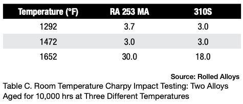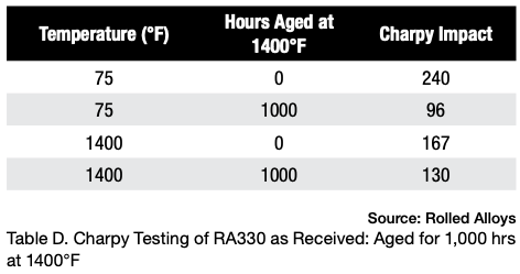 Table D displays the results of Charpy testing conducted on RA330 after aging. Although there is a slight decrease in ductility, the material still exhibits sufficient energy absorption to be considered quite ductile and safe for use at room temperature.