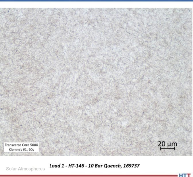 Micrographs of the H13 test specimens processed in each load were prepared (Images 4 and 5). The microstructure of each test specimen is characterized by a predominantly tempered martensitic microstructure with fine, undissolved carbides. The consistency of the microstructure across both trial loads further demonstrates that while the larger furnace utilized the higher horsepower, both resulted in a critical cooling rate sufficient to develop a fully martensitic microstructure.