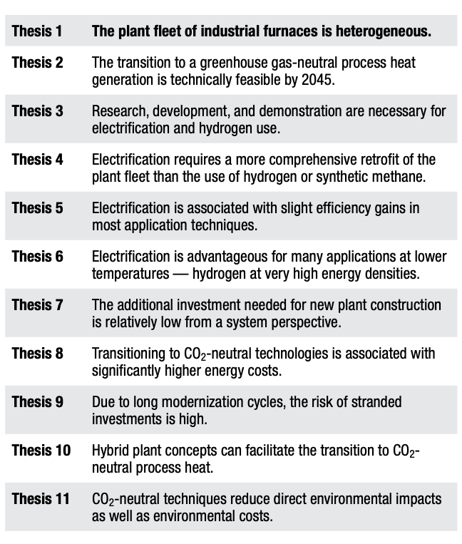 The central findings of the study are summarized in eleven theses on the transformation of process heat generation (Table B). In this article, Theses 1, 2, 6, and 9 are presented in detail, providing a broad overview of the essential findings. For a more in-depth examination of the theses, see the link to the original study.
