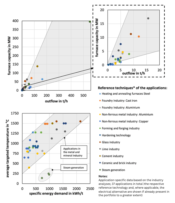 The metal and mineral industries are characterized by numerous small process plants (throughput of less than 20 tons per hour and plant capacity of less than 20 MW). At the same time, there are large facilities with significantly higher throughput and corresponding higher plant capacities. Figure 4 shows a selection of technical examples from the study. Examples of large plants include heating and annealing furnaces in the steel industry with capacities of up to 170 tons per hour or cathode shaft furnaces in the copper industry with throughputs of up to 80 tons per hour. It is observed that the specific energy requirement of a plant correlates with the process temperature. The higher the required temperature of a process, the higher the specific energy requirement.