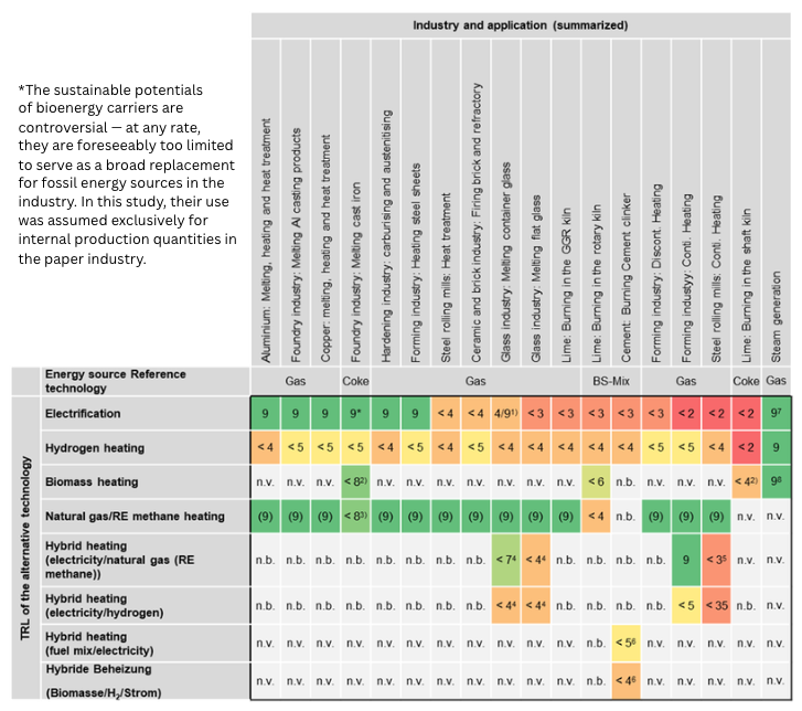 Both hydrogen and electrification can have a significant impact, although further research and development are needed in many areas. Across applications, it is evident that electrification generally requires the construction of new facilities. Transitioning from natural gas-operated reference technology to hydrogen involves less technical effort in terms of plant technology and can be accomplished by retrofitting the burner technology. Additionally, using hydrogen requires local infrastructure (pipes, valves) and its impacts on process and product quality need to be tested. Industrial-scale facilities are not yet available, resulting in a TRL of < 5, according to the study. However, with ongoing research and development in many projects, the TRL for many applications is expected to rise quickly in the coming years.
