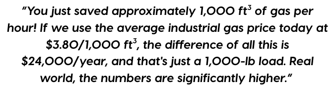 To really hit home what that meant, let’s look at a 1,000-lb load of steel. Our process temp is 1750°F. Our furnace and combustion efficiency used to be 20%. That would require 1,370,000 BTU to heat up in an hour. Now, with 75% furnace and burner efficiency, that’s 352,000 BTU. You just saved approximately 1,000 ft3 of gas per hour! If we use the average industrial gas price today at $3.80/1,000 ft3, the difference of all this is $24,000/year, and that’s just a 1,000-lb load. Real world, the numbers are significantly higher, as all you furnace guys know. Imagine the dollar savings when fuel was at $16.00/thm?