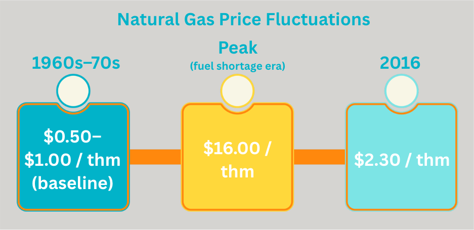 From 1930 to 1980, electricity pricing went up 500%. Natural gas started to bounce around in price. It was less than a $1.00/thm in the ’60s and ’70s, peaking during times of fuel shortage at $16.00/thm. Ten years later, in 2016, it hit $2.30/thm again. Some pretty wild fluctuations. In fact, it should be noted that the industry overseas had already begun to shift technologies — several years ahead of the U.S. — because they had been suffering with high fuel costs in Great Britain, Germany, Western Europe, and in Asian markets.