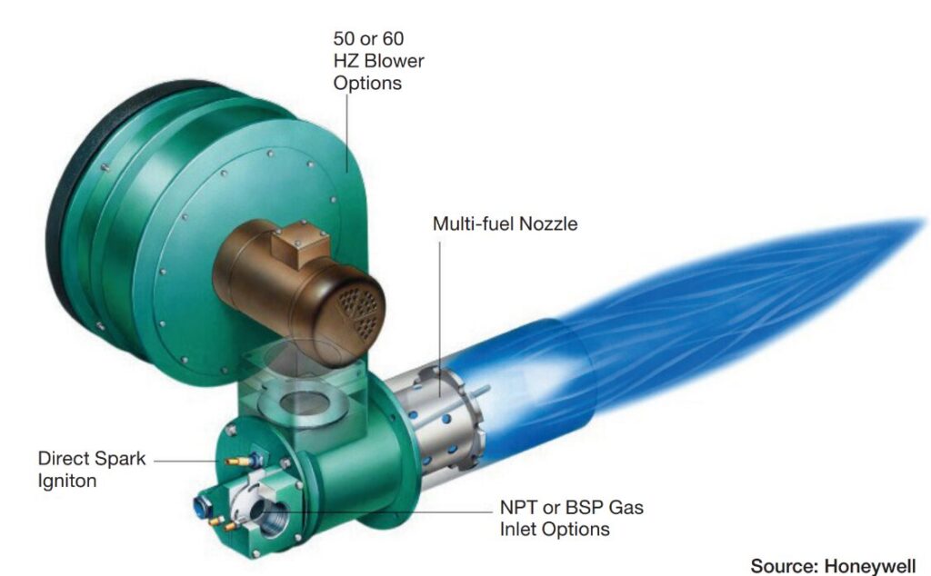 - Fuel nozzle fixed air mixing burners: This is where a steady stream of oxidant (air) is flowing, and the fuel is throttled up and down to affect ignition and capacity of fuel.