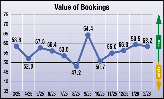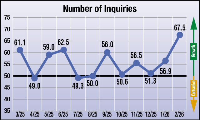 February’s data points to a steady manufacturing environment, as all four indices remain above the growth threshold, driven by a notable jump in expectations for growth in the Number of Inquiries at 67.5 (up from 56.9 in January). Bookings stayed firmly in growth territory, reflecting stable demand at 58.2 (from 59.5 in January). The Backlog index showed modest softening but remained neutral, indicating balance rather than decline at 52.5 (from 57.8 in January). Finally, the Health of the Manufacturing Economy index continued its upward trend at 57.9 (up from 56.1 in January).