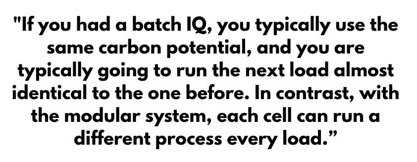 In addition, especially in a carburizing atmosphere situation, you can have every load be a different case depth — a different process in each cell — and then the next load that goes in that same cell can be totally different from the one before. For instance, if you had a batch IQ, you typically use the same carbon potential, and you are typically going to run the next load almost identical to the one before. In contrast, with the modular system, each cell can run a different process every load.