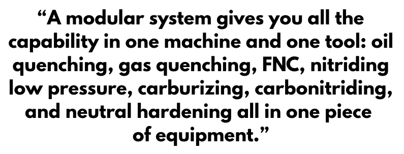 You can have a lot of flexibility in that one system that you have in the plant. I’ve visited hundreds of captive and commercial heat treaters. They generally have a number of furnaces in one area of the plant, and a number of furnaces in another area of the plant. A modular system gives you all the capability in one machine and one tool: oil quenching, gas quenching, FNC, nitriding low pressure, carburizing, carbonitriding, and neutral hardening all in one piece of equipment.