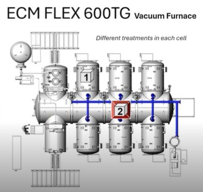 On the top left is the gas quench cell, which could be in this orientation or instead have an exit on the back as well. In this system, you could do neutral hardening, carbon nitriding, LPC, a number of the processes. This is a very valuable tool, especially in a commercial heat treat heat treat shop.