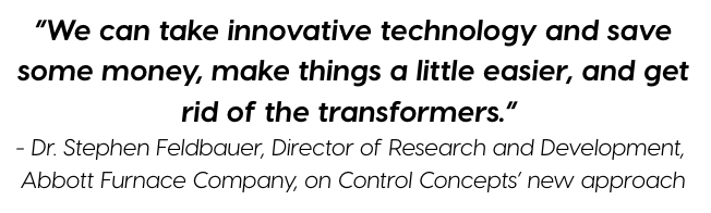 It was exciting! We had an electrically heated furnace, and then began talking with Tony and Christina. Control Concepts had this concept, no pun intended: Traditionally, design of an electrically heated furnace above a certain temperature (1850 degrees), we use silicon carbide heating elements and — due to resistance changes over time — we have to put transformers in there that allow us to keep upping the voltage and maintain heating capability. Control Concepts said, “Hey, we can take innovate technology and save some money, make things a little easier, and get rid of the transformers.”