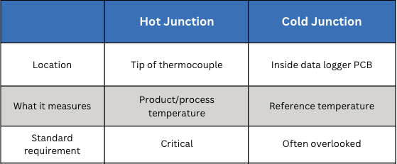 For some data loggers, that connector or that coal junction may actually be on the outside of the data logger, if it’s a universal connector. So it’s important that you understand where that cold junction is in-situ within your technology. The importance of the reading is the fact that you have a ratio between the hot junction where you are measuring the product and the cold junction where that physical measurement is being referenced inside the data logger.