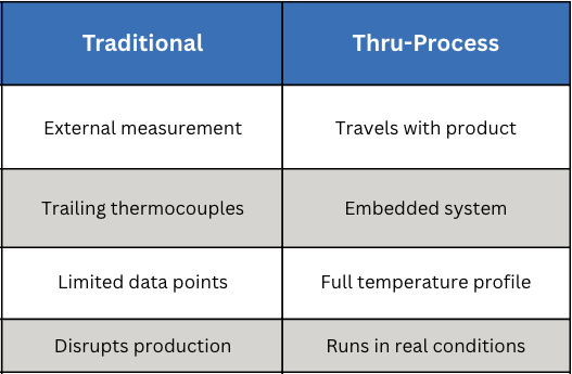 When you have that type of setup, and even in situations where you may be heat treating in a continuous furnace, the use of a trailing thermocouple becomes difficult at best, impractical and problematic in terms of safety at worst. For the modular approach, you have thermocouples going into different chambers and moving around. There are seals and automated doors in which the thermocouples will be trapped. As such, it’s very difficult to actually monitor the whole sequence of events that may be occurring in the heat treatment sequence.