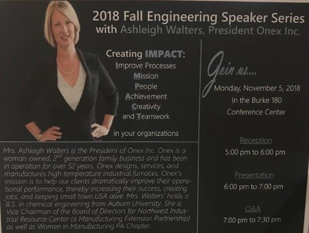 - Ashleigh Walters, president of Onex, Inc., recently participated in Penn State’s 2018 Fall Engineering Speaker Series, addressing how leadership can create impact through focusing on teamwork, creativity, improved processes, and mission.