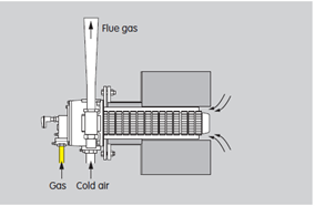 It bears noting that recirculation patterns can take on many variations depending on the type of heat treating you may be doing. Direct fired systems for stress relieving and straight up hardening operations use a high velocity direct fired system (Figure 2). That is where the aforementioned eductor pulls the flue gases out of the furnace and over the heat exchanger. Recirculation takes place in front of the burner in a high velocity stream exiting the nozzle. A percentage of the chamber gases gets pulled into that flue stream.