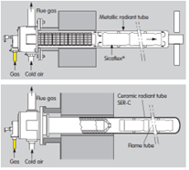 In the case of controlled atmosphere furnaces, where radiant tubes are utilized for the heating system, all sorts of different techniques exist. In the designs of recuperative recirculating style burners (i.e., FGR burners, flue gas recirculation), the tube designs are diverse and varied. Early designs of single ended tubes (SER) were the first to utilize recirculation designs (Figure 3).
