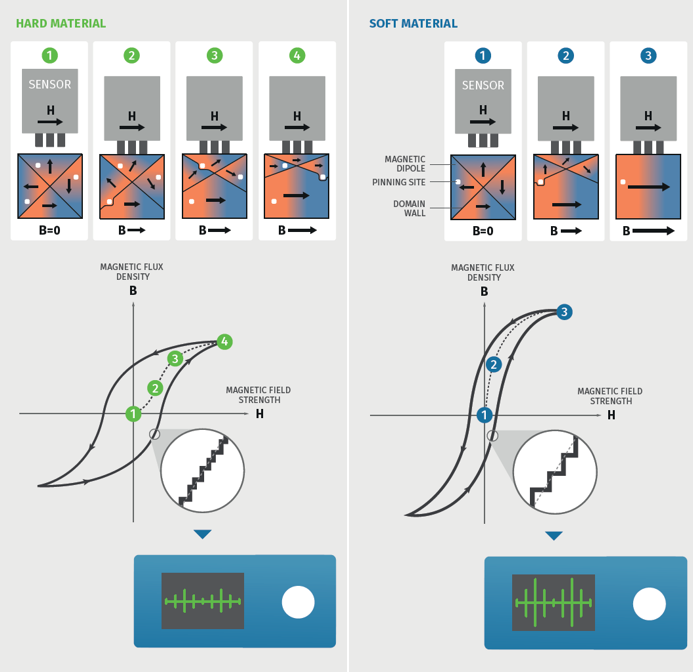 Hardness is related to the number of pinning sites (e.g., dislocations, precipitations, or other irregularities) in a material. When a magnetic field is applied to a ferromagnetic material, magnetic domain walls start to move. Domain walls collide with pinning sites in the material structure which impedes the domain wall movement. Magnetic domain walls move more easily in soft materials than in hard materials. Since hard materials contain numerous pinning sites, domain wall movements are more restricted. In soft materials, domain walls can make bigger jumps.