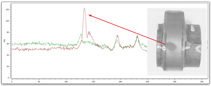 Subsequent correlation with microhardness profiles confirmed that regions with elevated Barkhausen activity corresponded to localized softening due to heat treatment defects or rehardening from grinding burn damage, while areas with reduced response aligned to the master part readings that verify successful production of parts. This dual sensitivity allowed engineers to distinguish between heat treatment and surface finishing issues using a single technique.