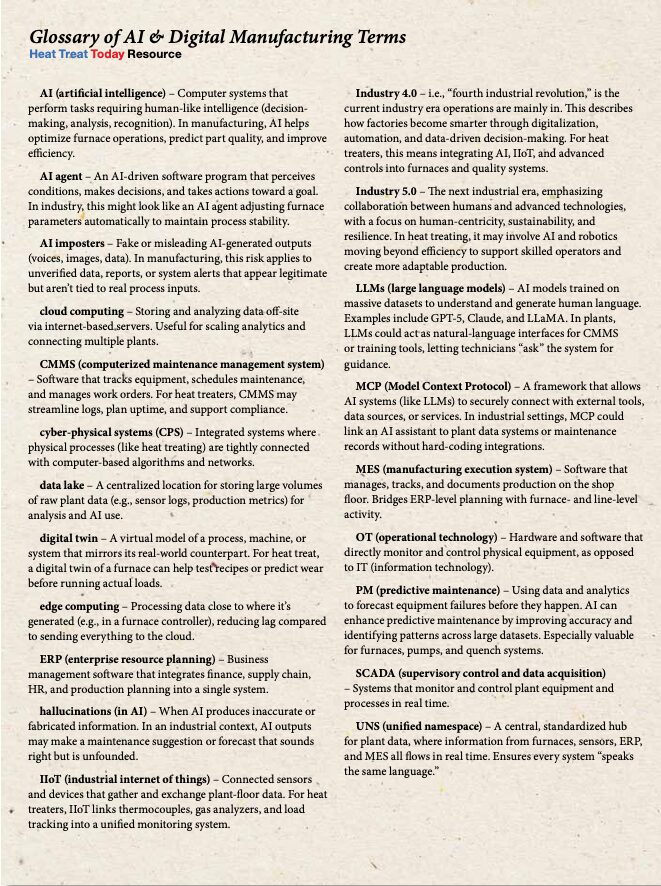 AI is most obviously used in equipment optimization, and there are a growing number of cases expanding from process control to energy optimization. Less obvious uses are within the heat treating plants. For example, AI in contract review can highlight key customer requirements, pull together relevant specifications, and help craft recipe design or selection.