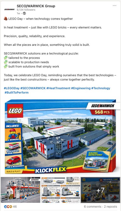From serious engineering insights to lighthearted LEGO builds, this week’s round-up of heat treat social media posts proves there’s no single way to tell the industry’s story. Whether you’re here to learn, be inspired, or just enjoy watching metal move, we’ll keep bringing you the posts worth a pause in your feed. Have a great weekend!